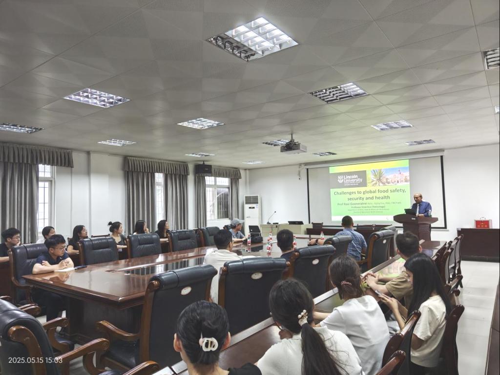 Ravi教授从人口增长、温室气体、环境污染、淡水资源匮乏、人畜共患病、新兴加工技术等方面,全面系统介绍了当前世界面临的食品安全问题和挑战。报告内容丰富,既有深度又有广度,参加会议的师生受益匪浅。报告会后,Ravi教授与师生围绕抗生素的使用、有机食品的市场竞争力和细胞培养肉等话题展开了深度交流和讨论。高加龙代表学院表达了师生赴新西兰林肯大学交流访问的愿景,Ravi教授对此致以诚挚欢迎,并明确表示将为双方合作提供全方位支持。