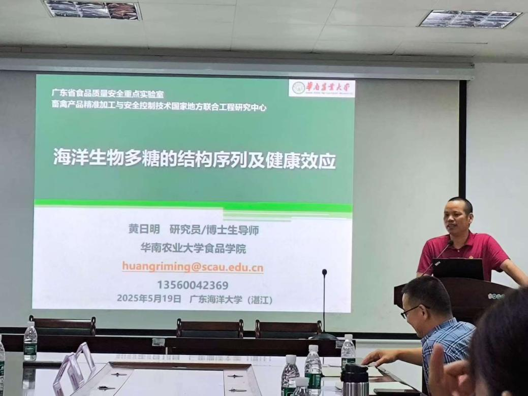 徐宝军教授基于转基因线虫模型,通过行为学实验等证实大豆异黄酮可显著改善空间学习记忆障碍,揭示了其通过调控关键信号通路减轻高糖所致神经元损伤的作用分子机制,为糖尿病相关认知功能障碍的防治提供了新思路。黄日明研究员系统阐述了团队在海洋生物多糖(总状蕨藻盾叶变种多糖、孔石莼多糖、海藻多糖)领域的研究进展,重点解析了其结构序列特征,并深入探究了其在诱导巨噬细胞铁死亡、调控免疫代谢及细胞代谢等方面的健康效应。报告内容丰富,为与会师生提供了重要的研究启示。报告会后,徐教授和黄研究员与师生展开了深度交流和讨论。
