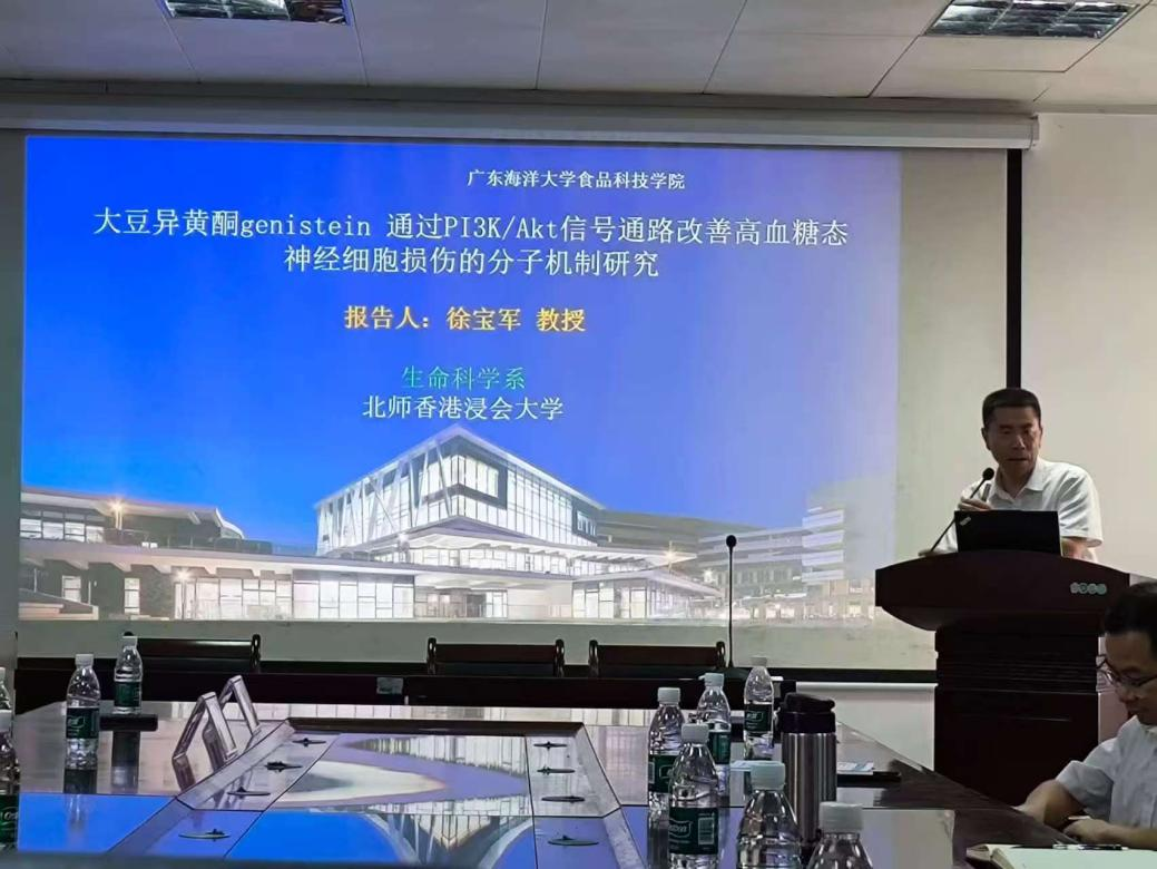 5月19日下午,北师香港浸会大学徐宝军教授和华南农业大学黄日明研究员应邀莅临william威廉中文官网,在望海楼A105会议室分别作了题为《大豆异黄酮genistein通过PI3K/Akt信号通路改善高糖神经细胞损伤的分子机制研究》和《海洋生物多糖的结构序列及健康效应》的专题学术报告。报告会由高加龙副经理主持,钟赛意教授、张翼教授、陈雷教授、张杰良教授及海洋功能因子与营养健康创新团队部分教师与研究生共同聆听了此次报告。