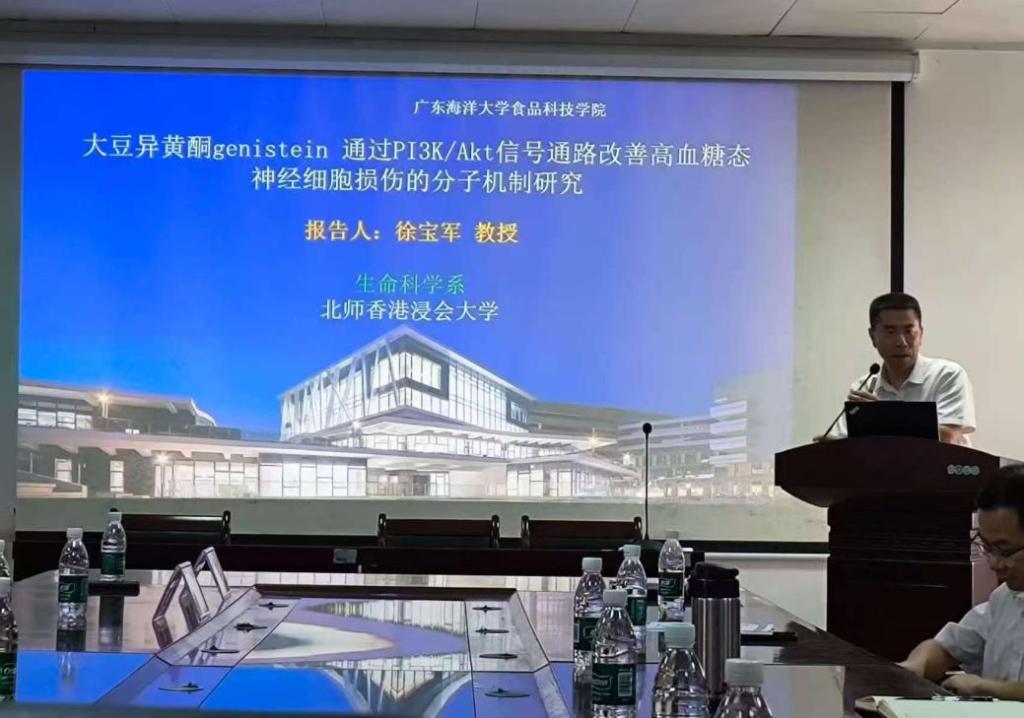 5月19日下午,北师香港浸会大学徐宝军教授和华南农业大学黄日明教授应邀莅临william威廉中文官网,在望海楼A105会议室分别作了题为《大豆异黄酮genistein通过PI3K/Akt信号通路改善高糖神经细胞损伤的分子机制研究》和《海洋生物多糖的结构序列及健康效应》的专题学术报告。报告会由高加龙副经理主持,钟赛意教授、张翼教授、陈雷教授、张杰良教授及海洋功能因子与营养健康创新团队部分教师与研究生共同聆听了此次报告。