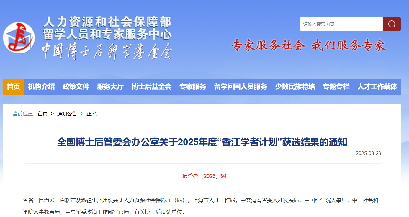 “香江学者计划”2010年起由全国博士后管委会办公室和香港学者协会联合实施。2025年起全国博士后管委会办公室、广东省人力资源和社会保障厅、香港学者协会全国首创、联合组织实施“香江学者计划(湾区项目)”,在原有全国资助人数不超过60名基础上,新增“湾区项目”,支持不超过20名广东优秀博士后赴港联合培养。通过选派内地博士到香港指定的大学,在港方合作导师的指导下,以港方大学合约研究人员的身份开展博士后研究,为期2年,由内地和香港分别提供资助,共计对博士后资助超过70万元人民币。