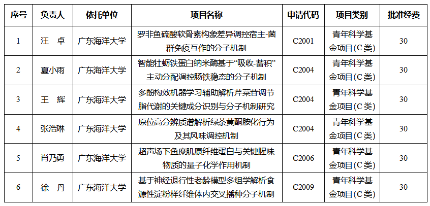 8月27日,国家自然科学基金委员会公布了2025年集中接收申请项目评审结果,食品科学与工程学科获资助青年科学基金项目6项(湛江校区5项、阳江校区1项),批准经费180万元。