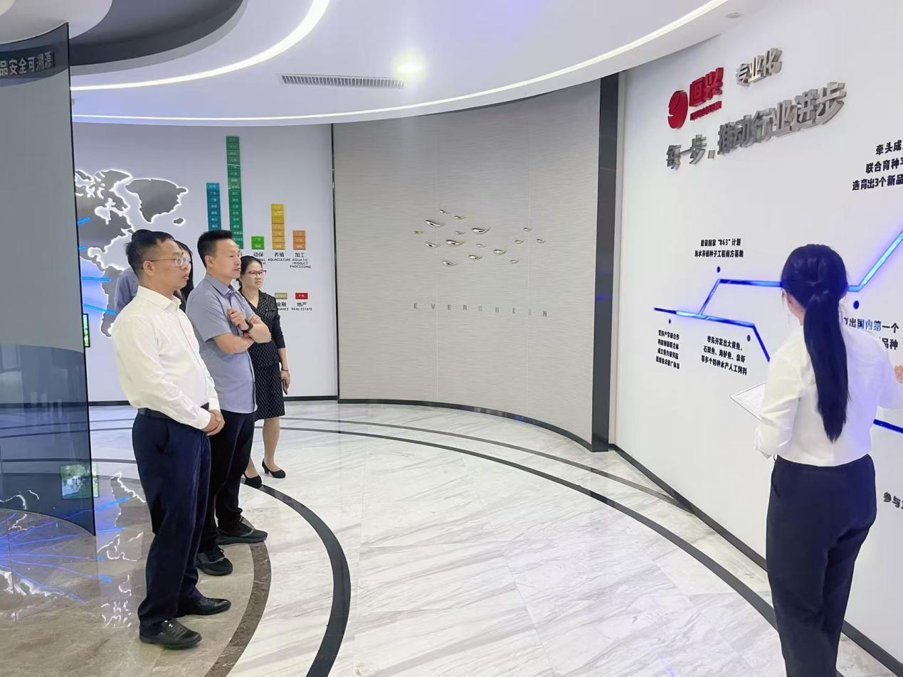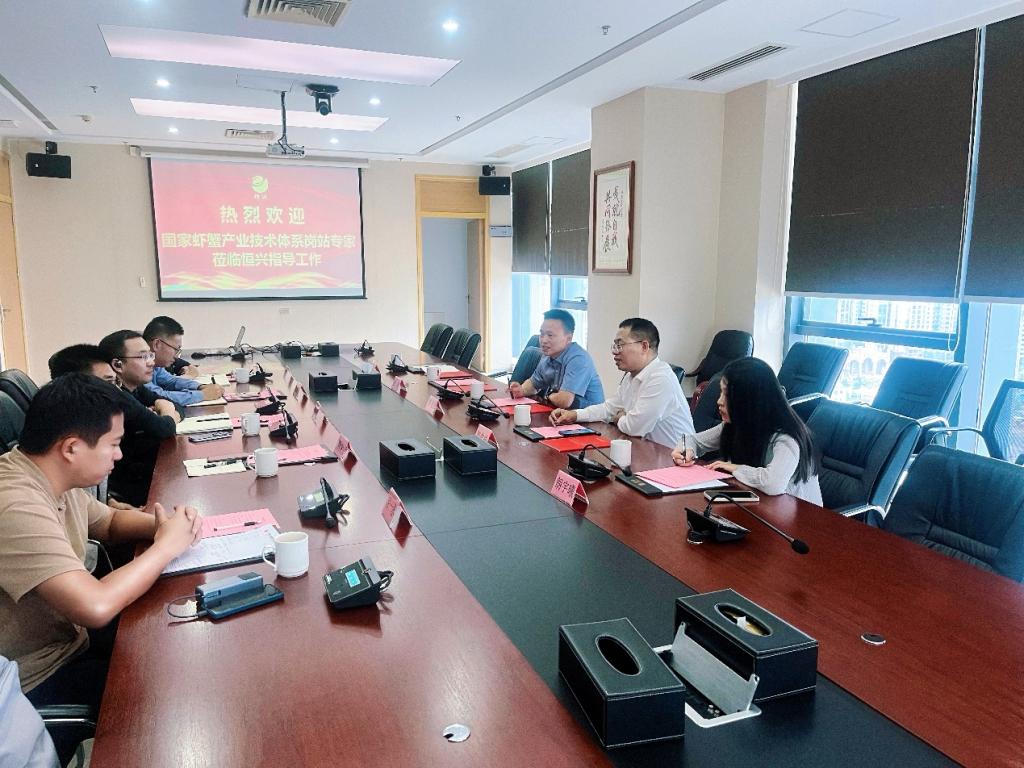在广东恒兴集团有限公司,集团常务副总裁、研究院经理张海涛,院办副主任、国家虾蟹产业技术体系湛江综合试验站站长赵丽梅,研究院经理助理、水产饲料所所长姜永杰,种苗所所长陈奕彬,以及高级研发工程师胡一丞等领导与专家,分别介绍了公司在凡纳滨对虾育种、育苗、养殖、饲料研发、动保产品开发、水产品加工等领域的产业优势及科研合作需求。双方表示,期待未来能够进一步加强合作,共同推动凡纳滨对虾全产业链的绿色、智能、高质量发展。