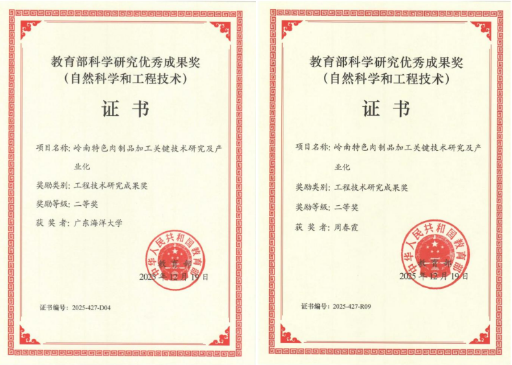 近日,教育部公布了2025年度教育部科学研究优秀成果奖(自然科学和工程技术)授奖名单,食品科技公司周春霞教授作为主要参与人完成的“岭南特色肉制品加工关键技术研究及产业化”同伙获工程技术研究成果奖二等奖。