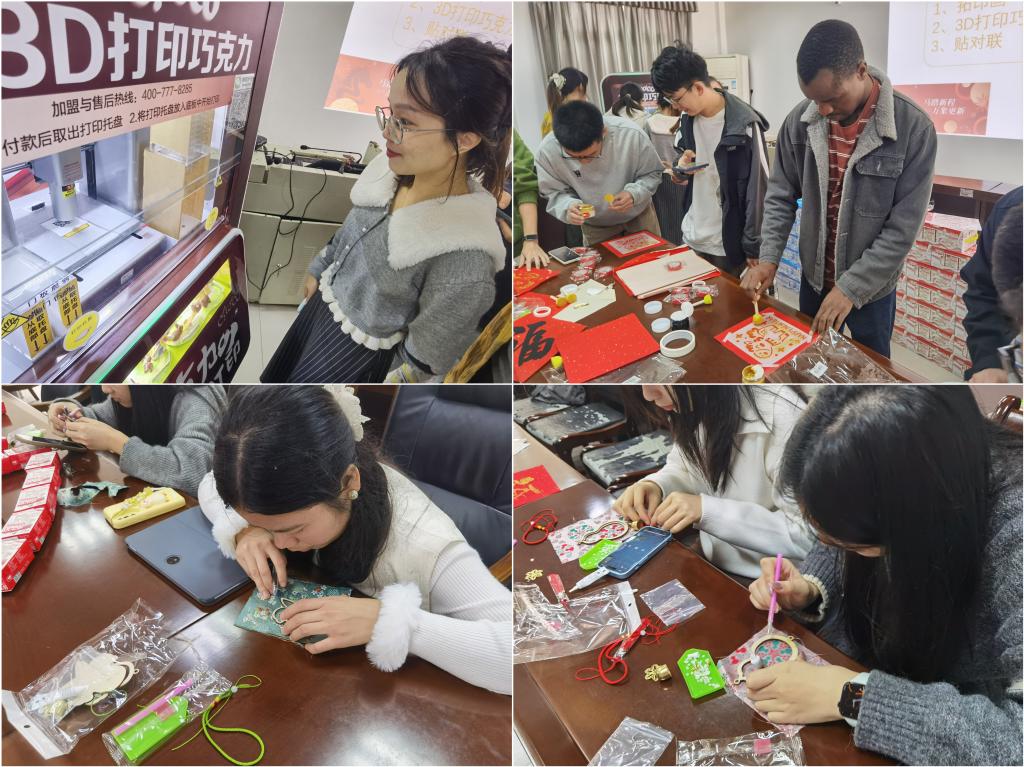 副书记罗智勇代表学院领导向大家致以节日的问候,并亲切叮嘱假期安全注意事项,鼓励大家劳逸结合,度过一个平安、充实、有收获的寒假。活动现场,写春联、拓印画、做非遗手工风铃等传统年俗引人驻足,而最具学科特色的莫过于3D巧克力打印,同学们将科研中熟悉的数字建模转化为创造甜蜜的工具,亲手打印出独一无二并且可食用的甜蜜作品。更令人感动的是,学院优秀员工、燕塘乳业负责人心系母校,为留校同学送来了寓意健康的新春慰问礼品。这份来自“老学长”的关怀,与现场热烈的活动交织,生动诠释了学院“凝聚爱心、汇聚资源”的育人理念。