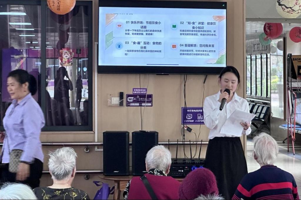 活动前期,团队主动与养老服务中心对接沟通,发现老人们大多患有“三高”疾病,且普遍存在“无糖食品可随便吃”“骨头汤最补钙”等认知误区。有鉴于此,团队认真打磨PPT、精心设计道具,将专业知识转化为通俗易懂的语言,确保科普工作接地气、有实效。宣讲过程中,程沁婷以贴近生活的话题为切入点,详细讲解“三高”饮食原则和“彩虹食物”理念,并运用“骨头汤钙含量不及一杯牛奶”的典型案例,有力纠正常见误区。此外,团队还精心编成了“少盐少油少糖,多蔬多果多全谷”的口诀,极大地方便了老人们记忆。
