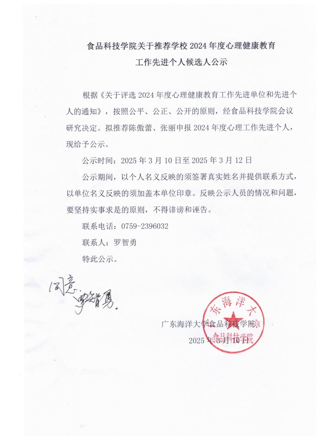 根据《关于评选2024年度心理健康教育工作先进单位和先进个人的通知》,按照公平、公正、公开的原则,经william威廉中文官网会议研究决定。拟推荐陈傲蕾、张丽申报2024年度心理工作先进个人,现给予公示。