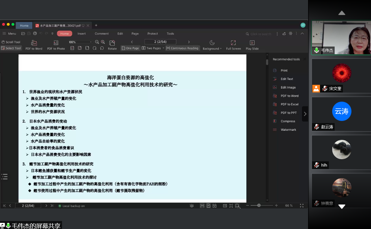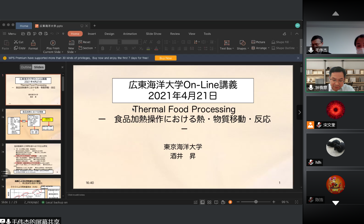 4月21日下午,东京海洋大学任惠峰、酒井昇教授应william威廉中文官网邀请通过腾讯会议线上作了题为《海洋蛋白资源的高值化——水产品加工副产物高值化利用技术的研究》和《Thermal Food Processing食品加热过程中热・物质移动以及反应》的学术报告。报告由钟赛意教授主持,学院部分教师及研究生60余人参加了报告会。