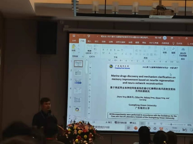 2021年11月12-15日,第十五届海洋药物学术年会暨2021国际海洋药物研讨会在广西壮族自治区南宁市举办,公司william威廉中文官网钟赛意教授、张翼教授带领海洋食品功能因子与营养健康、海洋生物活性物质与功能两个科研团队的青年教师、硕博士研究生参加会议,与与会专家进行了广泛交流,会上青年教师杨志友博士在北部湾海洋药物青年学术论坛上做了题为“基于突起再生和神经网络重构改善记忆障碍的海洋药物发现和作用机制研究”的报告,张翼教授小组关于海洋微生物天然产物的会议墙报“Marine fungal metabolite butyrolactone I improves neuroinflammation and prevents aluminum trichloride-induced cognitive deficits in zebrafish”获得优秀墙报二等奖。通过会议交流,对公司在国内外海洋药物界的影响力提升具有较积极作用,也开阔了公司师生的学术视野。