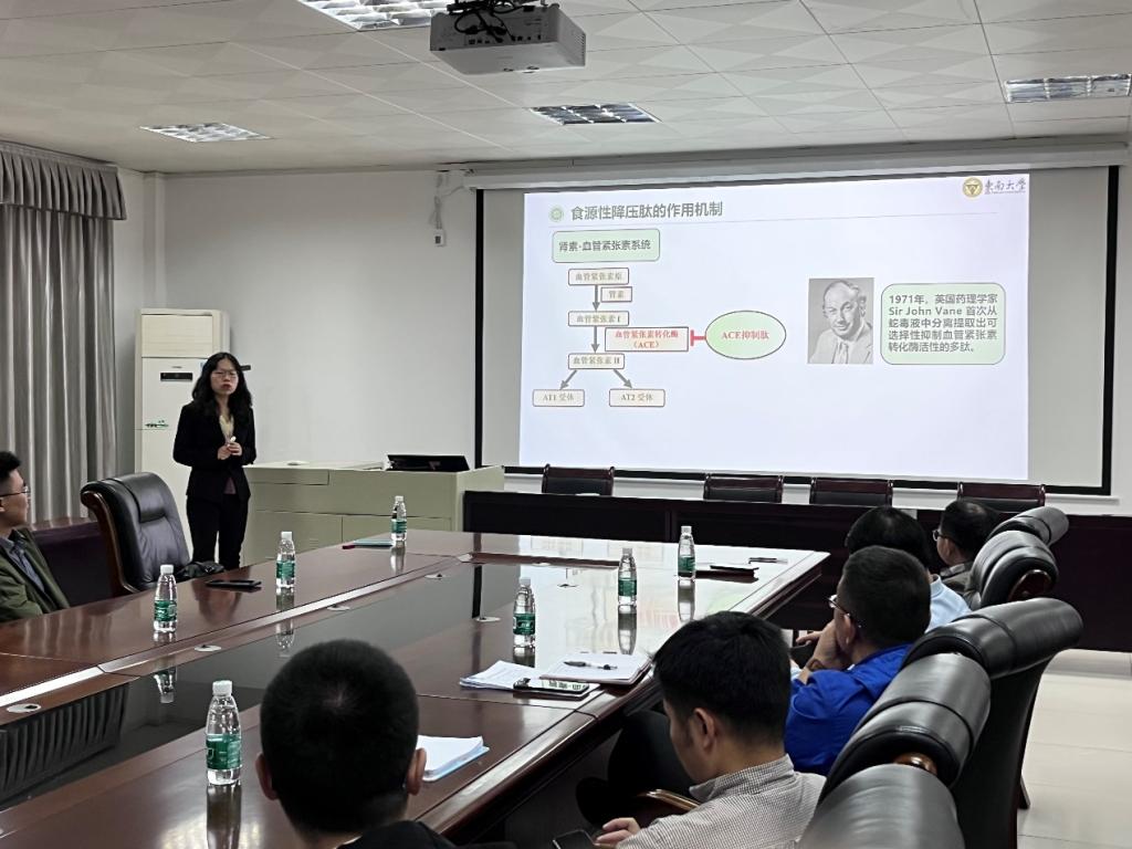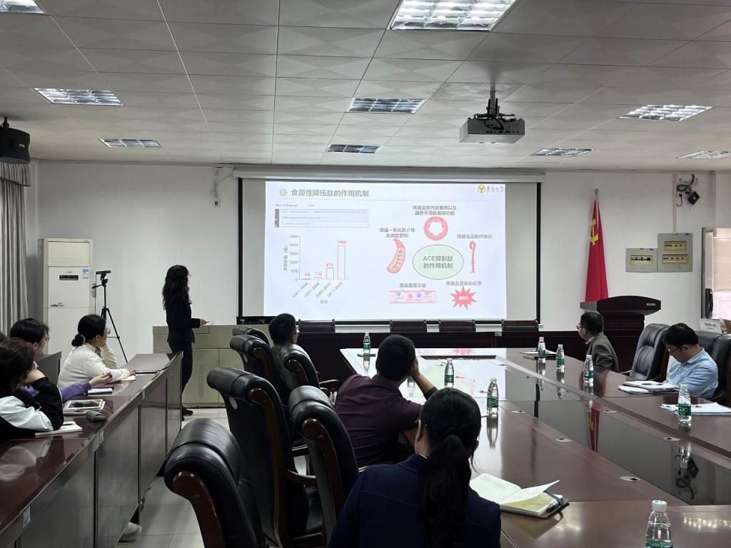 报告会上,廖教授介绍了食源性活性肽的发展历史、活性肽的分离纯化、功效评价、人群研究、基于深度学习算法的构-效关系研究以及基于多组学的机制研究,着重报告了其团队在降血压肽和降血糖肽方面的研究成果。同时廖教授还分享了国家自然科学基金申报心得,从项目选题,到申报属性选择,再到科学问题凝练,全方面解析了国基申报各环节要点。报告结束后,与会师生就感兴趣的问题与廖教授进行了交流,现场气氛热烈。此次学术交流拓宽了公司师生的研究思路和学术视野,对青年博士申报国家自然科学基金也起到了很好的借鉴和启发作用。