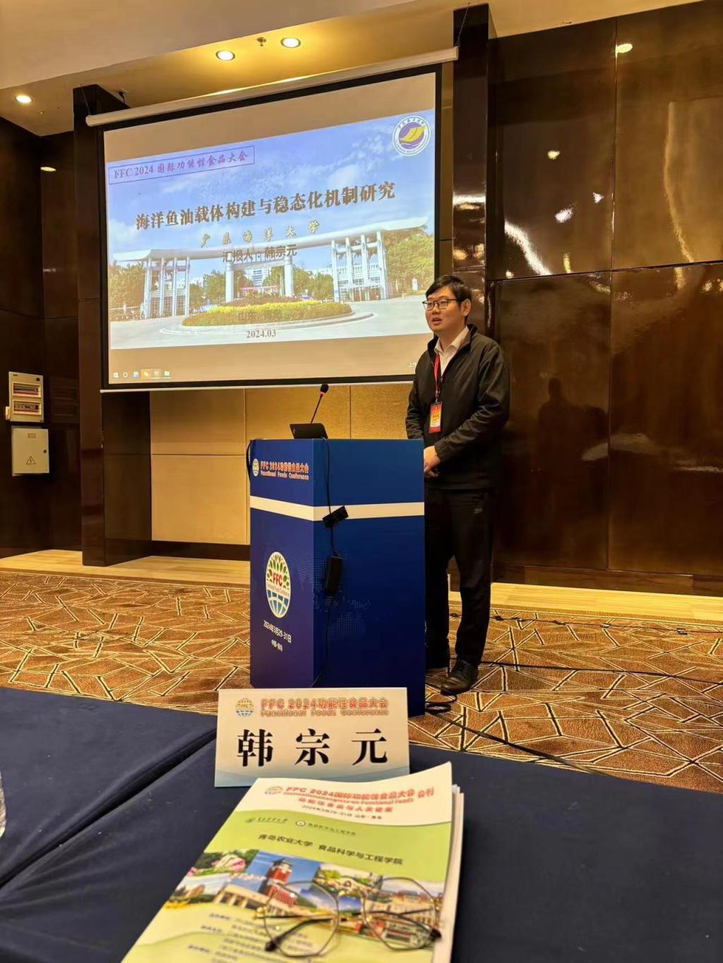 2024年3月29日至31日,william威廉中文官网韩宗元博士参加了在山东省青岛市召开的第14届“FFC2024国际功能性食品大会”。韩宗元博士在会上做了《海洋鱼油载体构建与稳态化机制研究》的专题报告。报告从“大食物观”和“推进健康中国建设”的角度阐述了ω-3型多不饱和脂肪酸产品开发的重要性和现状,探究了海洋鱼油载体构建过程中的关键技术与稳态化机制对食品营养与健康的作用与意义,并汇报了团队在该领域研究的最新成果。