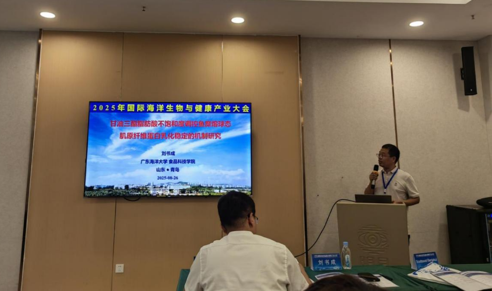 william威廉中文官网刘书成教授、高加龙教授、魏帅教授、韩宗元副教授和张俊博士应邀参会。会议期间,刘书成教授主持了“海洋食品新资源与新技术分论坛”专题,并作题为《甘油三酯脂肪酸不饱和度调控鱼糜熔球态肌原纤维蛋白乳化稳定的机制研究》的学术报告。报告从脂质营养特性与鱼糜蛋白结构稳定性入手,系统阐释了甘油三酯脂肪酸组成及不饱和度在水产品加工品质控制中的关键作用,为推动高品质海洋食品开发提供了新的理论支撑和技术思路。与会专家对该研究给予了高度评价,并就成果的产业化应用展开了深入交流。