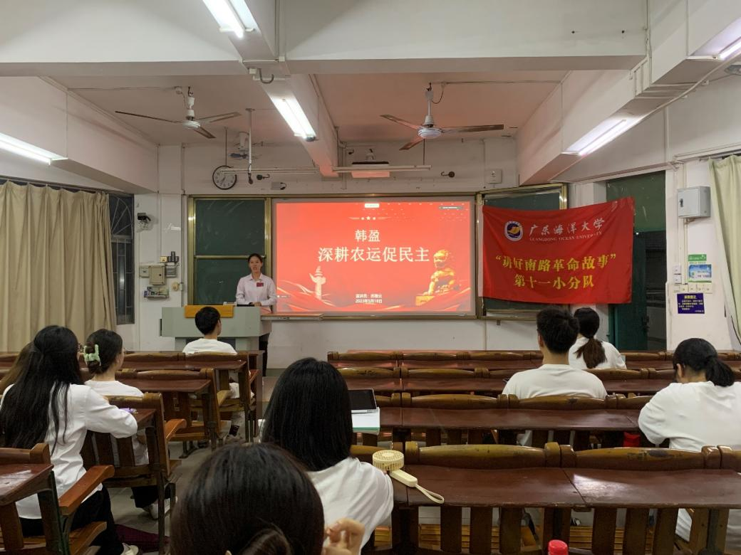 “讲好南路革命故事”第十一小分队共5名同志宣讲南路革命先辈的故事。苏雅云同志讲述了韩盈立志革命、传播真理、舍小家为大家,为党的事业付出了生命的英雄事迹;雷娟娟同志以“磨难少年鸿鹄志——钟竹筠”为题,讲述钟竹筠致力于把妇女解放与当地的工农运动结合起来,引导妇女走出家门,到社会上组织参与反帝反封建的政治斗争的故事;贺年同志讲述了谍海英豪王克的故事,王克凭借对党的无限忠诚和聪明才智,成功化险为夷隐身魔窟;孙万泽同志以为“十过家门而不入的平民书记——黄平民”为题,讲述黄平民勇敢揭露北洋政府陋行,勇担重任,重建廉江农运组织,领导武装革命斗争故事。黄娟萍同志以“铁道神枪手——郑金”为题,讲述郑金深入虎穴,夜斩“黑肉蛇”,最终英勇就义的故事。