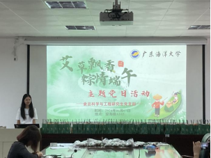 为弘扬中华民族的传统文化,增强同学们的文化自信与归属感,端午节来临之际,食品科学与工程研究生党支部于6月7日在望海楼A105举办“艾草飘香,粽情端午”主题党日活动,辅导员、支部成员、支部特邀非党员博士生等40余人参加活动。活动由曾惠蓝同志主持。
