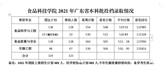 7月9日下午,学院委派党委副书记丁永成、辅导员杨如雪参加学校2021年在海滨校区远程录取现场本科招生录取工作,2021年公司计划招生490人(其中食品科学与工程专业210人、食品质量与安全专业210人、生物工程专业70人),2021年公司招生生源充足,高分生源人数增幅明显,成绩喜人,食品科学与工程专业招生录取情况如下:食品科学与工程专业实际招生210人(其中广东省138人,本科提前批10人,本科批次128人,最高分554分,最低分508分,平均分519.56分,第一志愿录取率为100%);其他省72人。