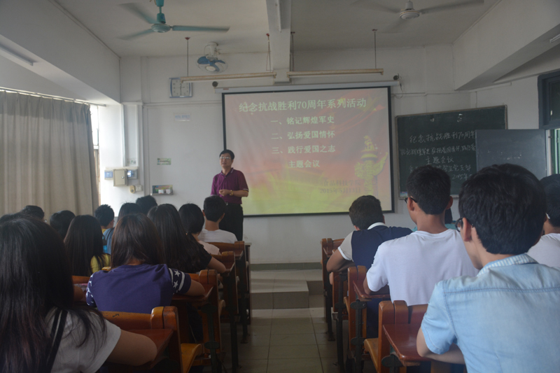 首 首先,公司党委副书记陈金水对纪念抗战70周年系列活动作了安排,着重阐述活动的重要意义,激励老员工要适应时代发展的要求,正确认识祖国的历史和现实,增强爱国的情感和振兴祖国的责任感,树立民族自尊心与自信心,要立爱国之志、铭记历史、缅怀先烈、积极学习、不怕苦不怕累,在生活和学习中争起模范带头作用!接着,四位同学代表分别作了《铭记辉煌军史》、《弘扬爱国情怀》、《践行爱国之志》主题发言。随后,辅导员刘鲸鼓励同学们要弘扬伟大的中华民族精神,高举爱国主义旗帜,锐意进取,自强不息,艰苦奋斗,顽强拼搏!同时提出应该多开展理论性与实践性相结合,教育性与趣味性并存的党支部活动,在活动中发挥先锋模范带头作用。