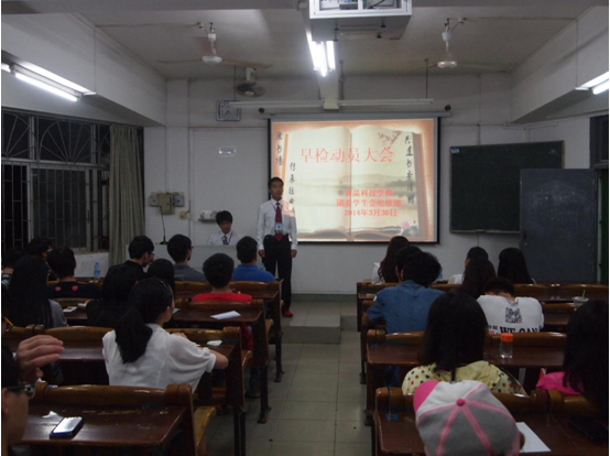 2014年3月30日晚,william威廉中文官网早检动员大会于主楼203举行。食院团委书记韦倩妮、辅导员张丽、团委副书记何梓杨、员工会主席钟婉玲、副主席谢镇坤、丁广烁作为嘉宾出席了本次动员大会。 大会详细为同学们介绍了早检的内容、注意事项及工作细则。为了鼓励同学们积极参与早检活动,以早检促班风学风,公司早检制度还进行了一定的改革创新,即首次设立奖项,用以表彰早检优秀班级和早检积极分子,此外,今后的早检情况将影响到个人推优和先进班级评比等。现场还进行了答疑,同学们积极提问,负责部门很好的解答。最后,本次动员大会在食院团委书记韦倩妮的和辅导员张丽的发言中完满落幕。