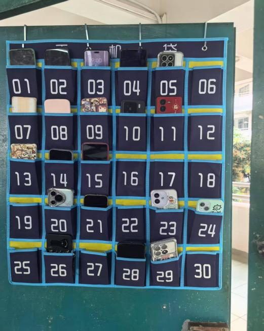 公司为大一各班级配备了专门的手机收纳袋,这些收纳袋被整齐地挂在教室墙壁上,每个收纳袋都标注了号码,对应员工的学号。上课前,员工们自觉将手机调至静音或关机状态,放入自己座位号对应的收纳袋中,下课后再取回自己的手机。